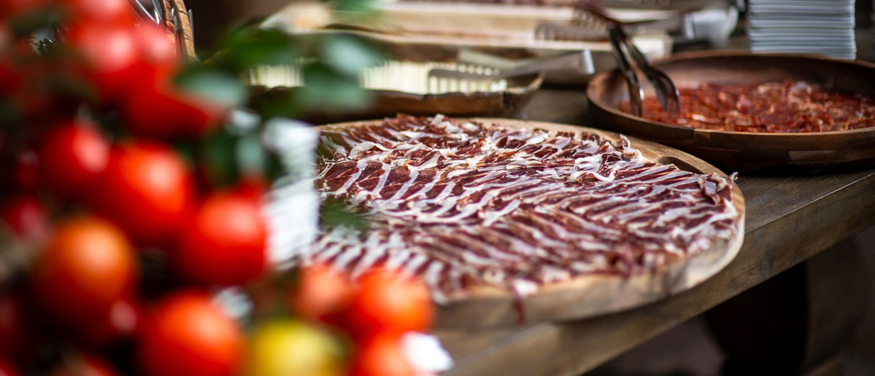 At a private residence, this 60th birthday celebration read like a feature in a culinary magazine. Cocktail hour was a true farm-to-table showcase, with chefs preparing made-to-order bites before guests’ eyes: Cheeses paired with golden olive oils, a glistening tuna carving station, and the irresistible theater of hand-sliced jamón ibérico.