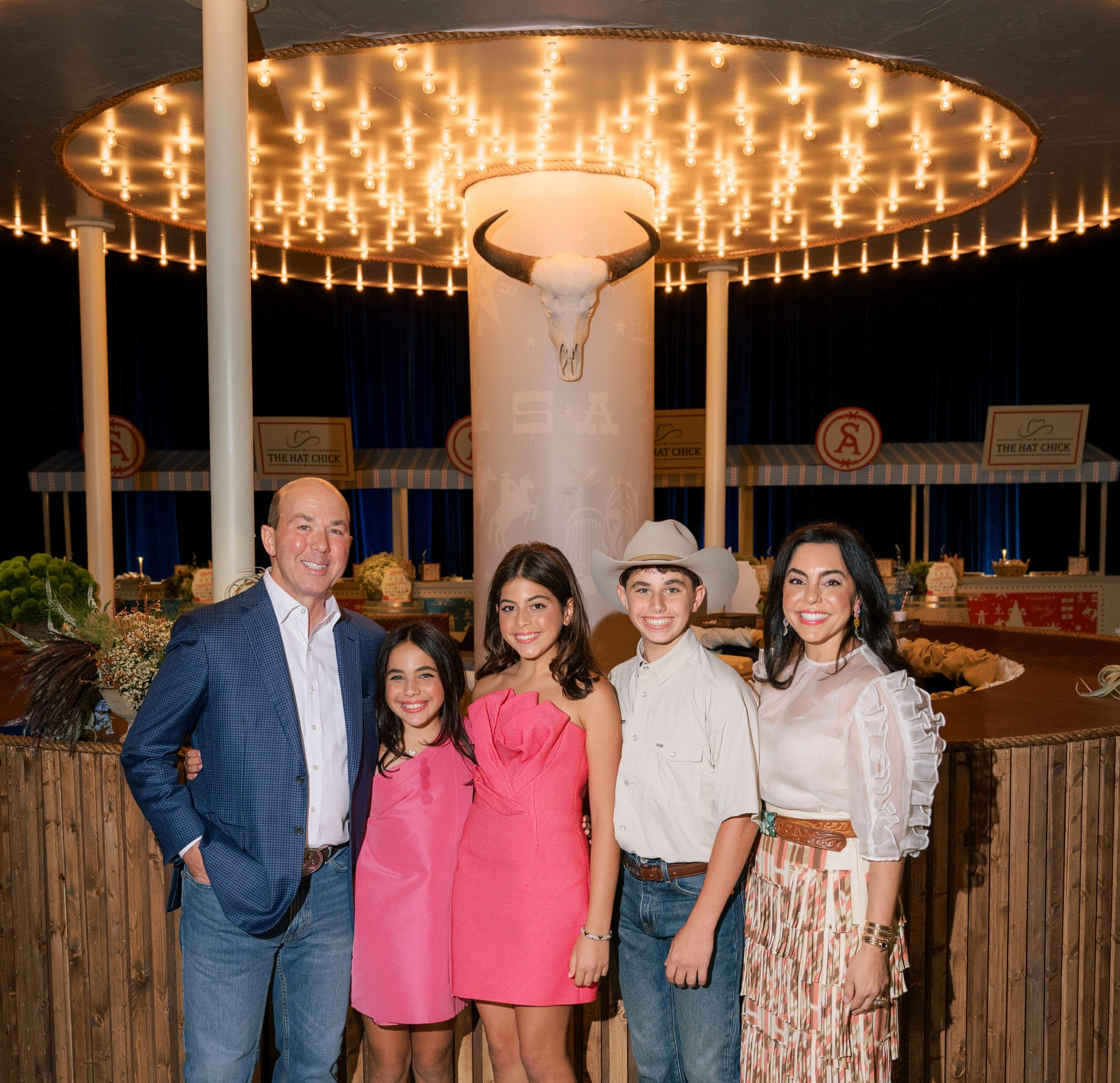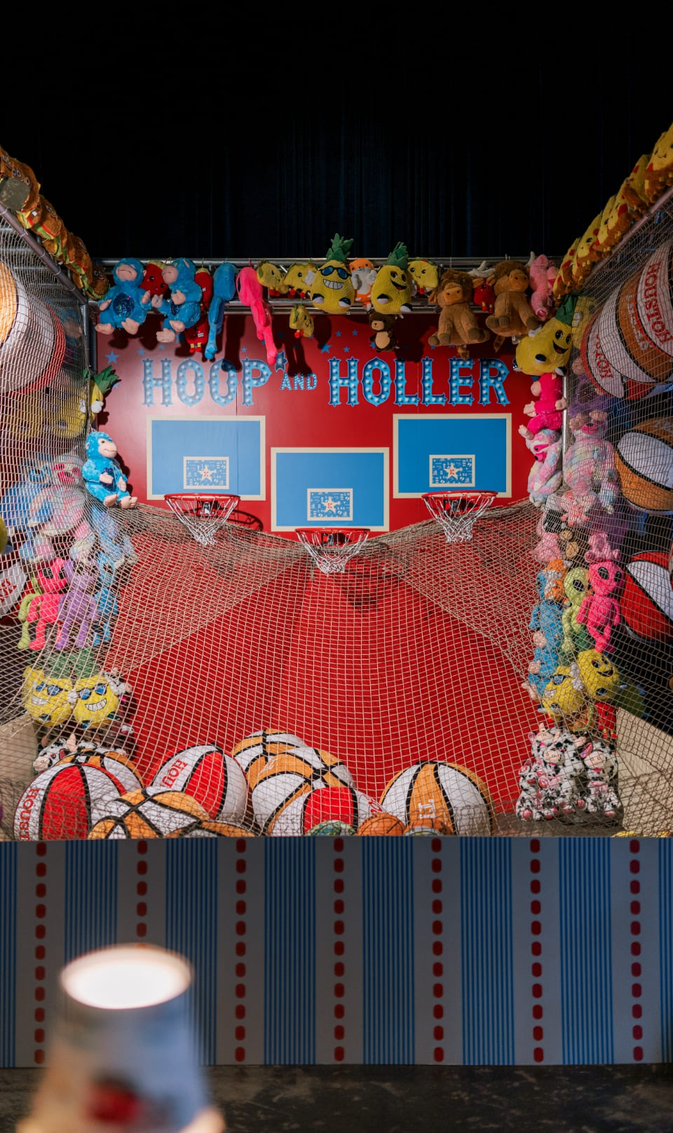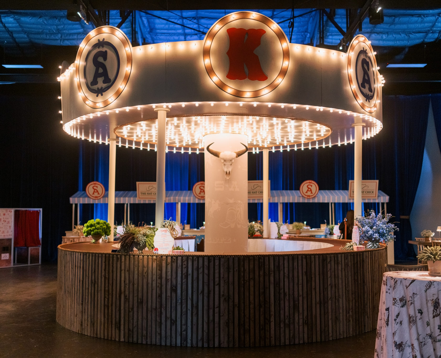Inside, the space pulsed with rodeo spirit. Carnival games sparked friendly competition, rodeo clowns danced through the crowd, and the energy felt straight out of Rodeo season. Dinner was a feast of Texas favorites: smoked barbecue from Feges BBQ, nostalgic carnival classics, Royers Pie from Round Top, and scoops of iconic Blue Bell ice cream.