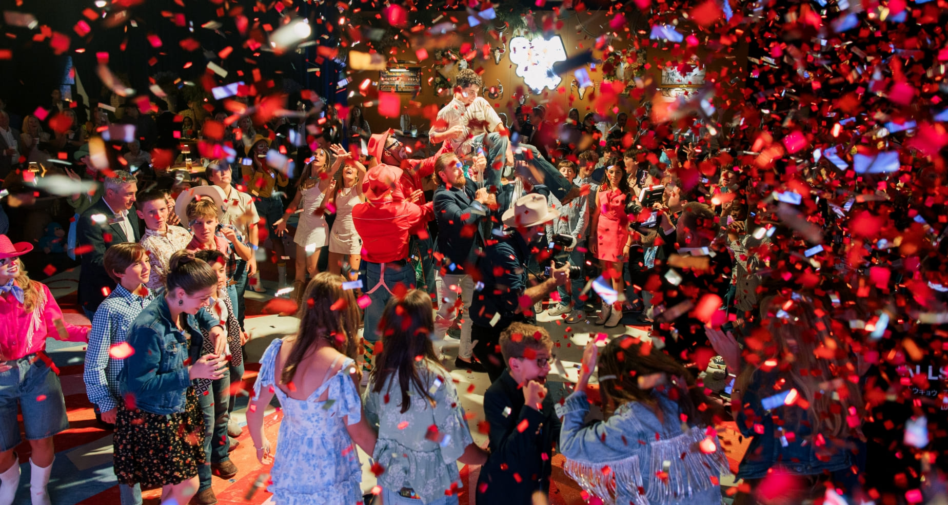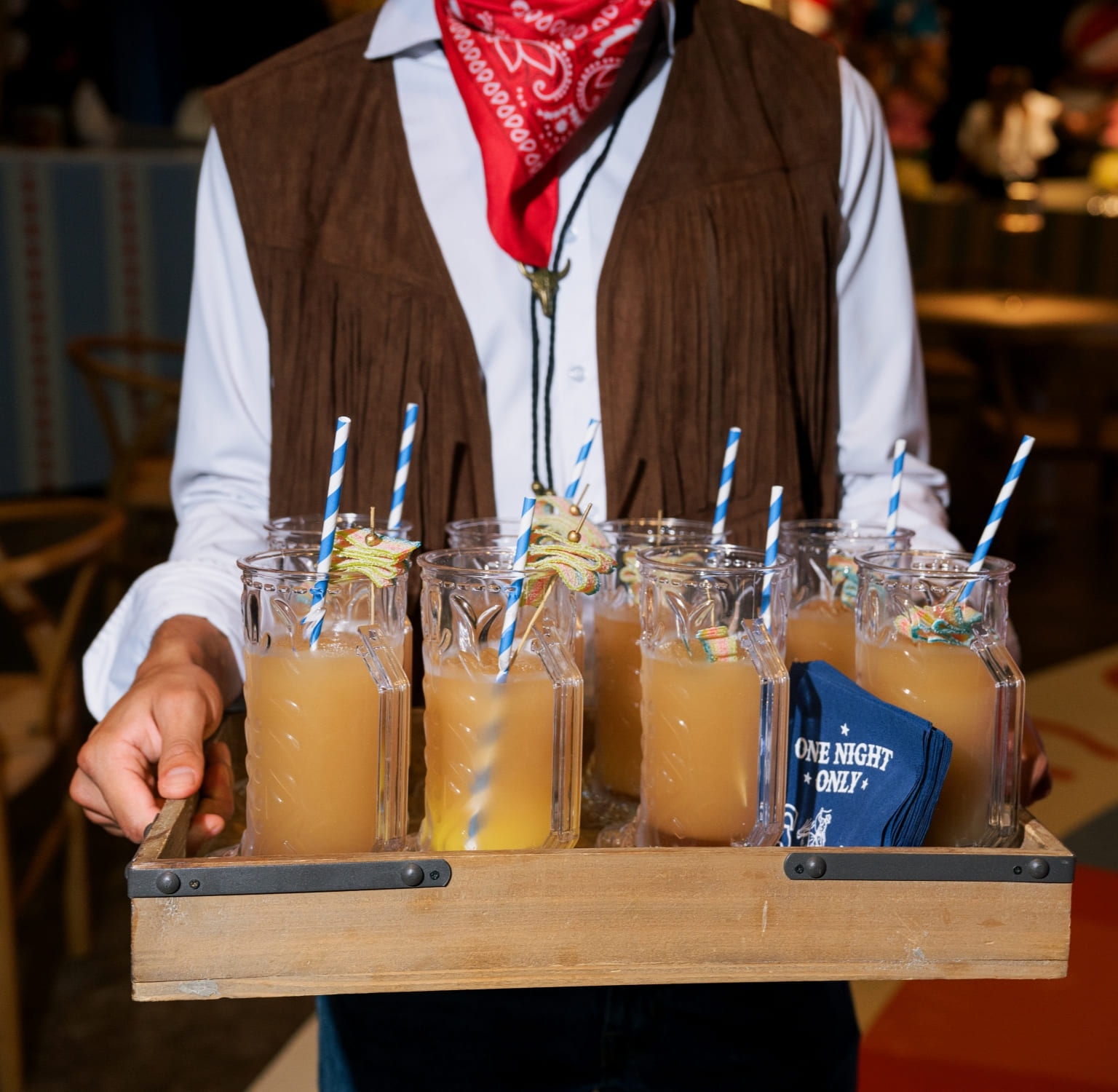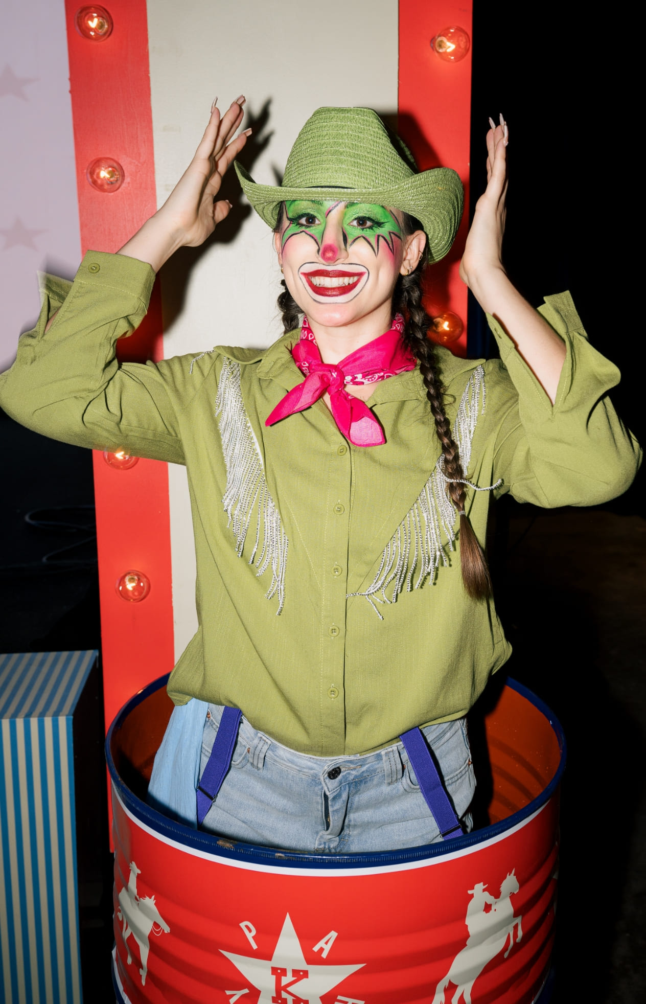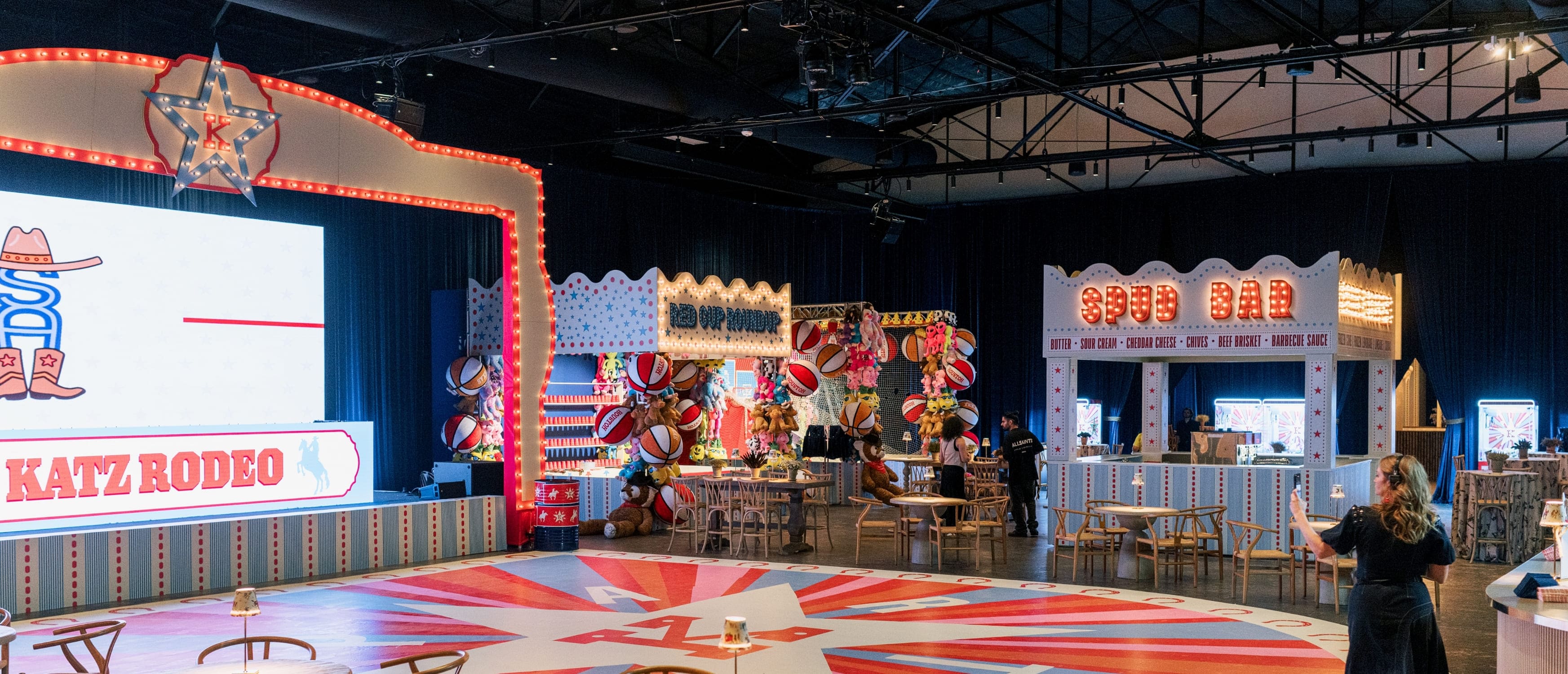 Inside, the space pulsed with rodeo spirit. Carnival games sparked friendly competition, rodeo clowns danced through the crowd, and the energy felt straight out of Rodeo season. Dinner was a feast of Texas favorites: smoked barbecue from Feges BBQ, nostalgic carnival classics, Royers Pie from Round Top, and scoops of iconic Blue Bell ice cream.