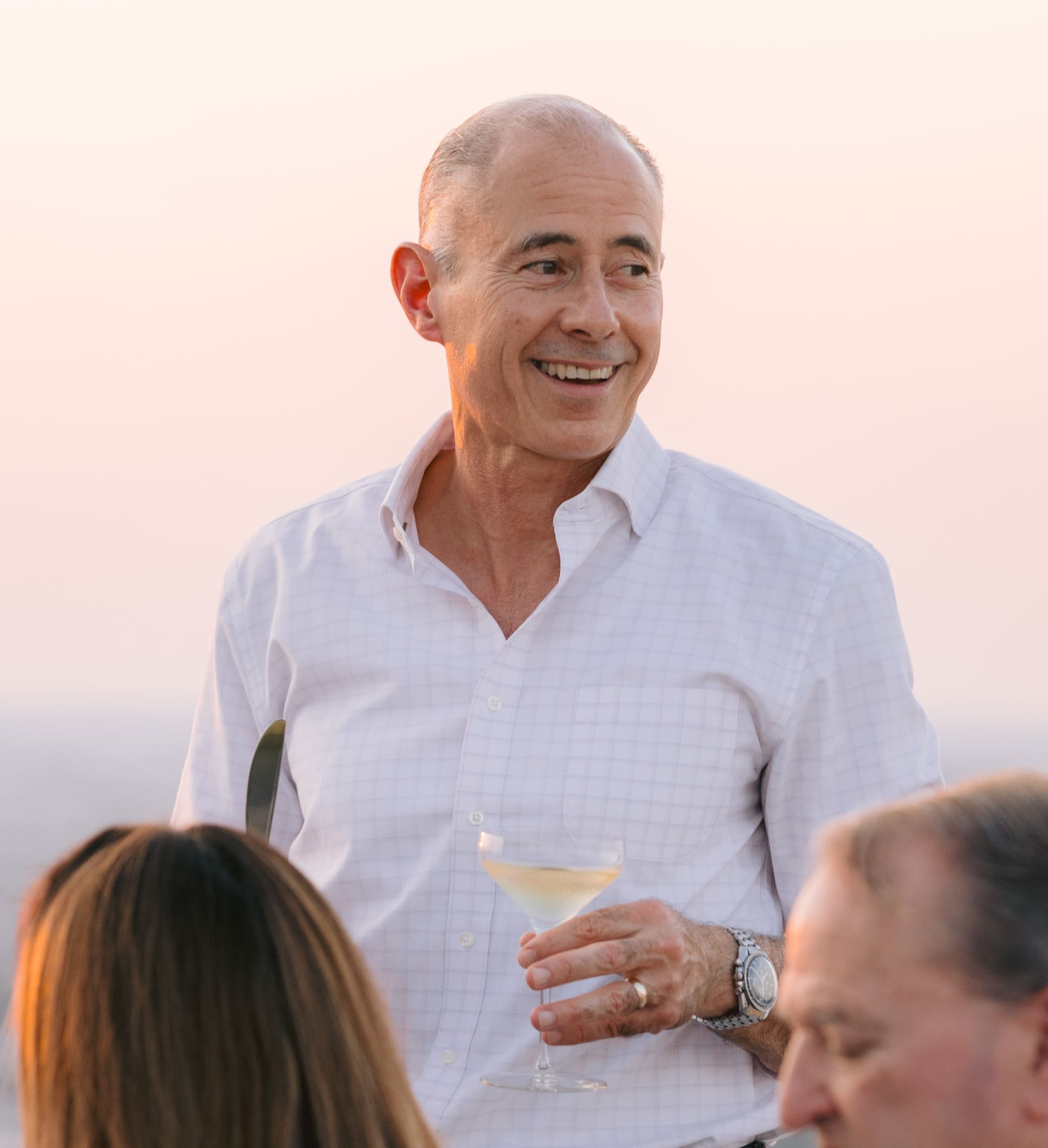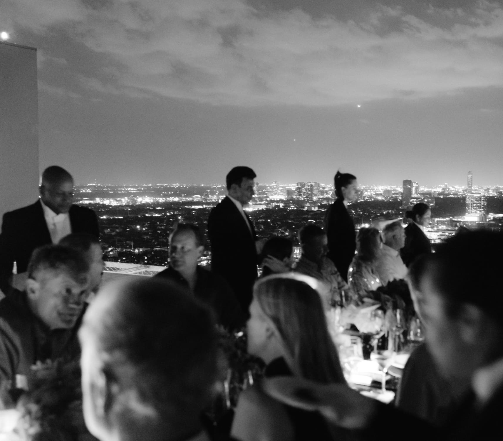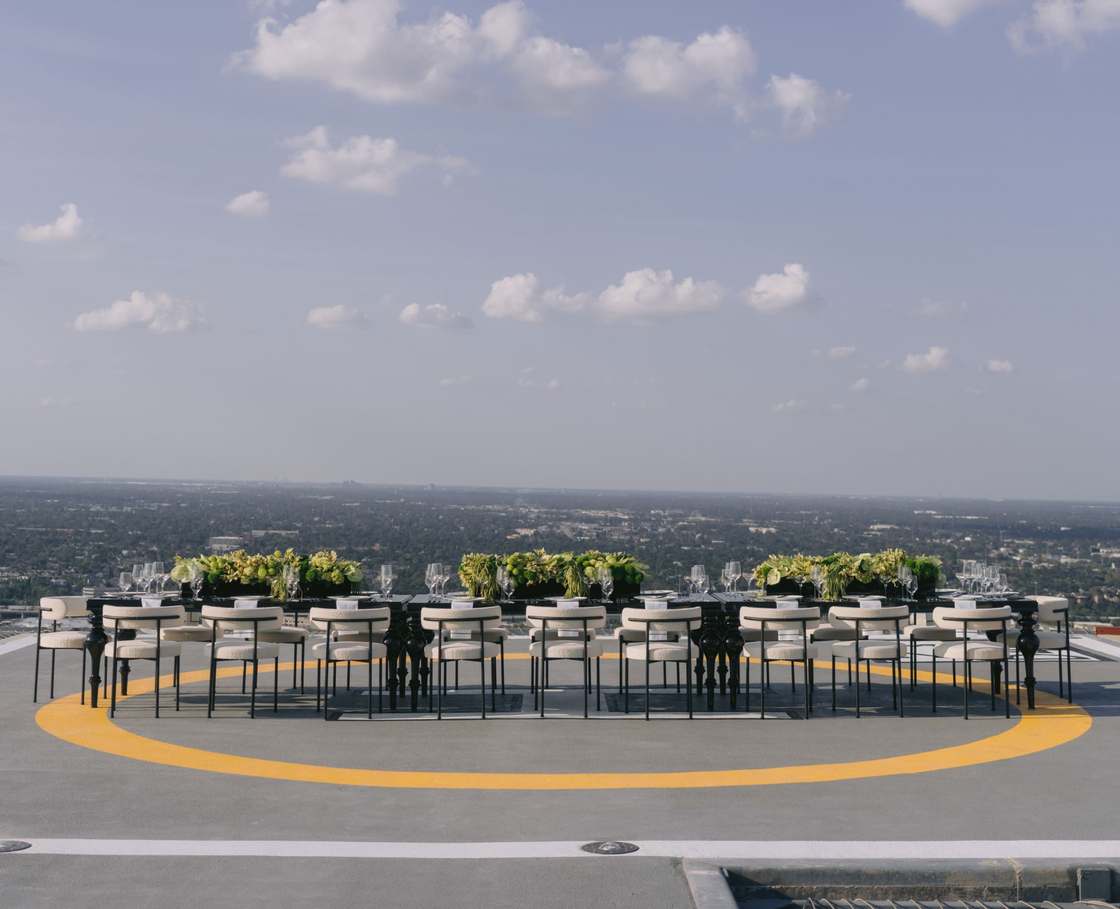 The evening began with a sense of intrigue. Guests were told only to dress for dinner, unaware of where the night would take them. The reveal was nothing short of cinematic: the helipad of The Thompson Hotel, a striking high-rise their host had built, transformed into an open-air dining room in the clouds.