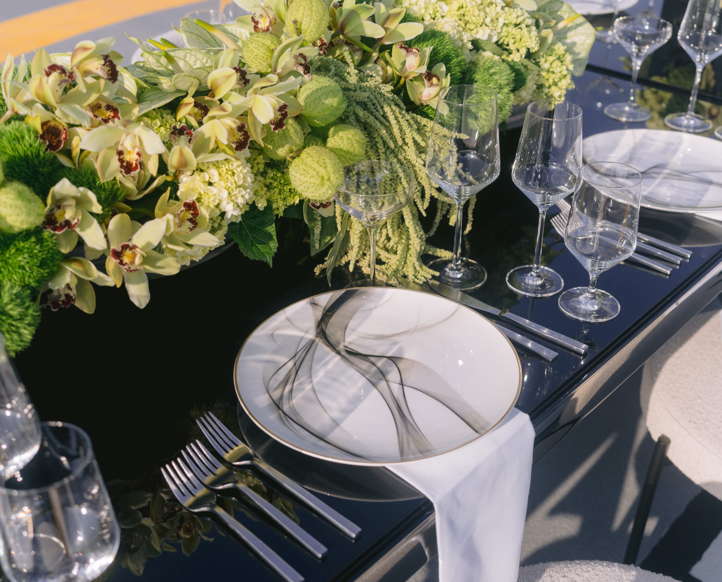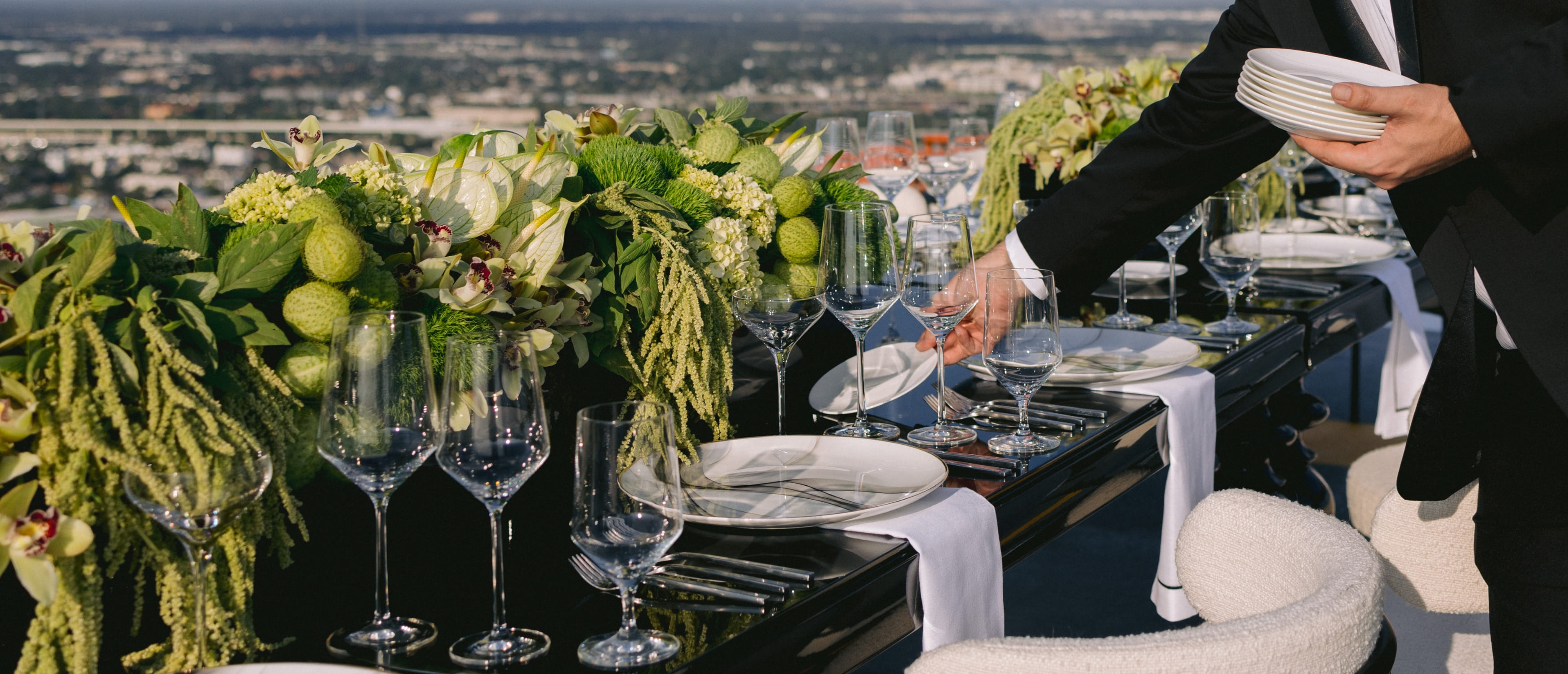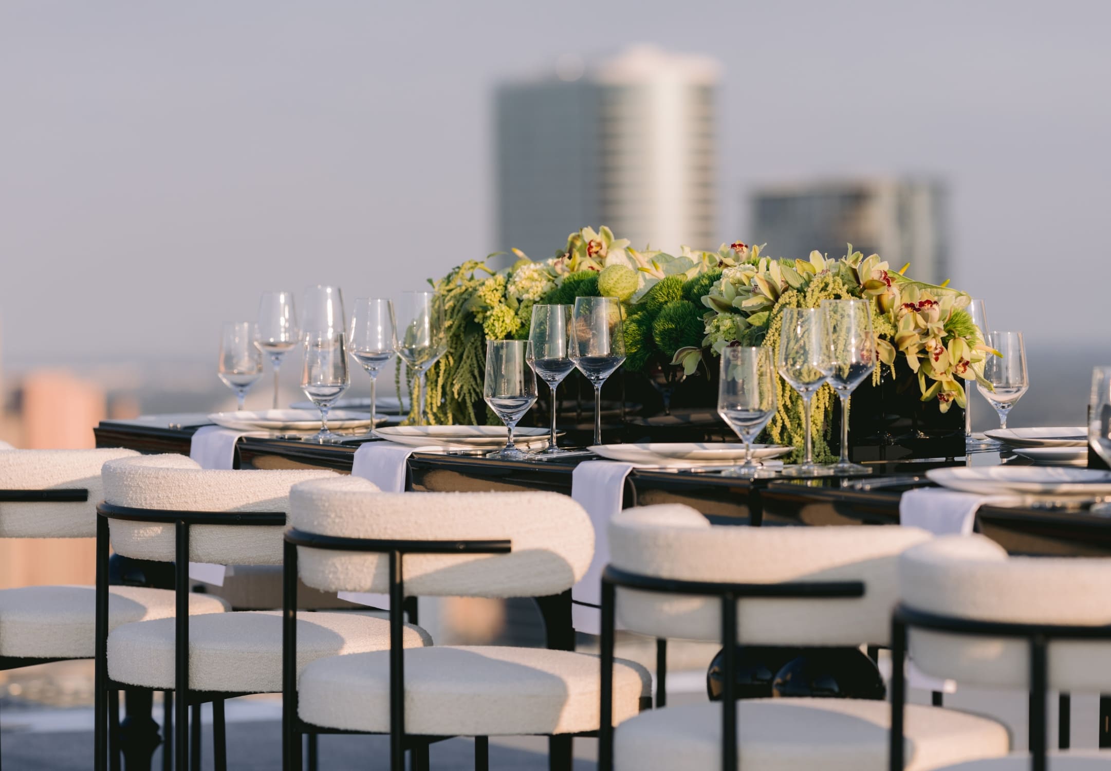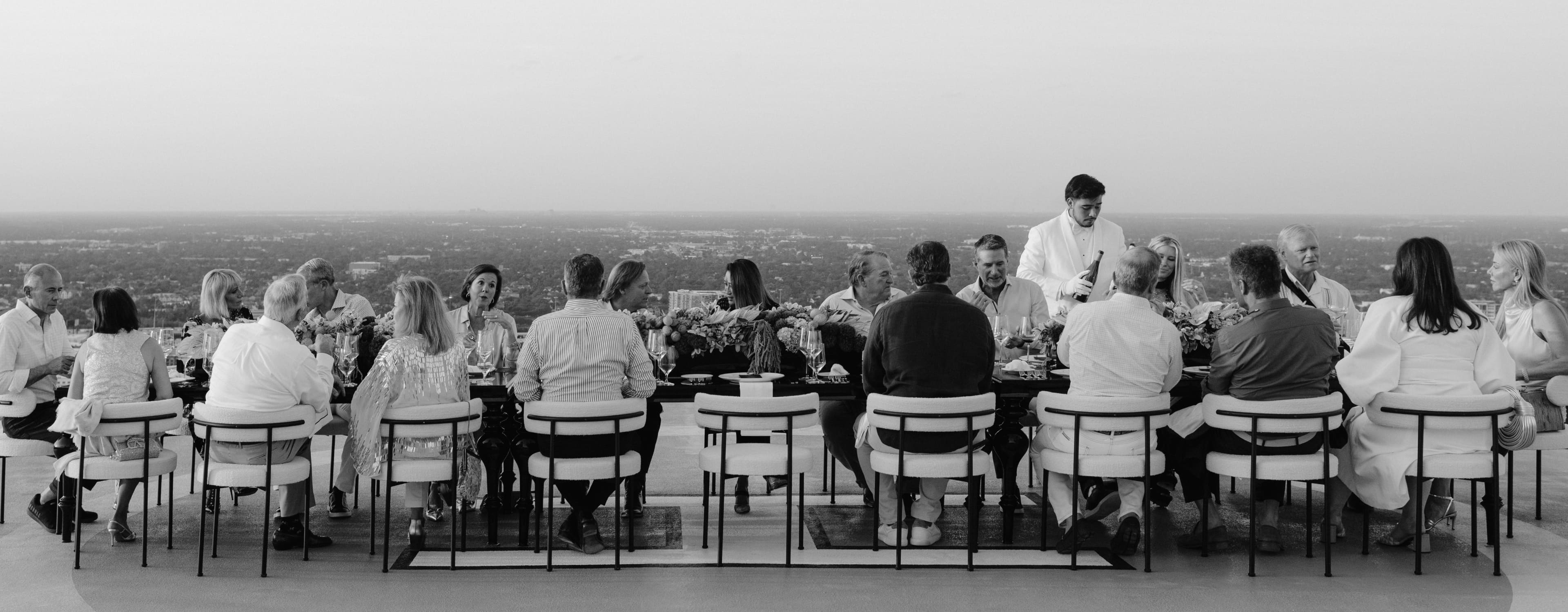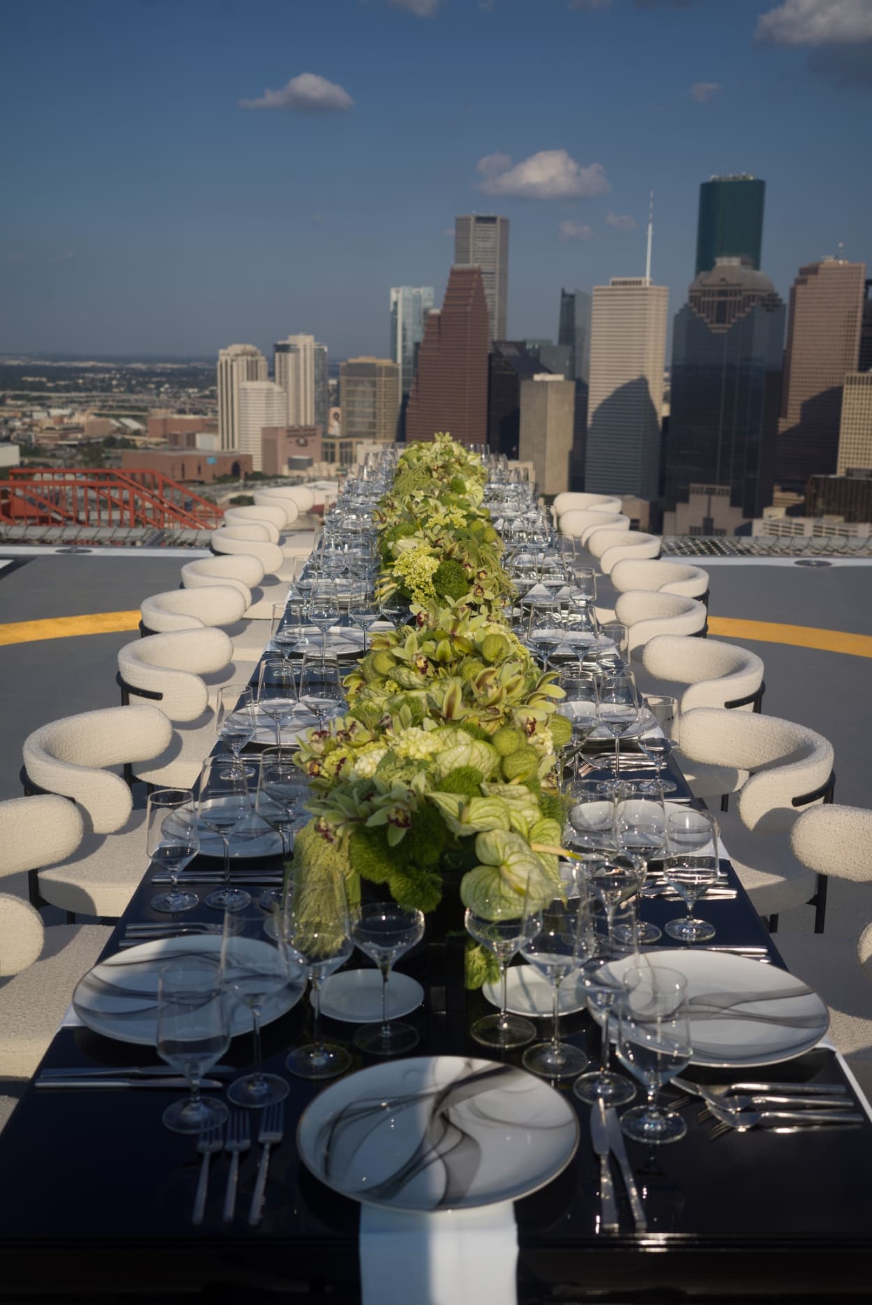 As the sun melted into the horizon, guests gathered around a sleek, sophisticated table set against Houston’s glittering skyline. A chef-curated menu unfolded in perfect cadence with the setting sun, each course more artful than the last. By the time the city lights began to twinkle below, the scene felt like something out of a magazine: intimate, elevated, and entirely unforgettable.
