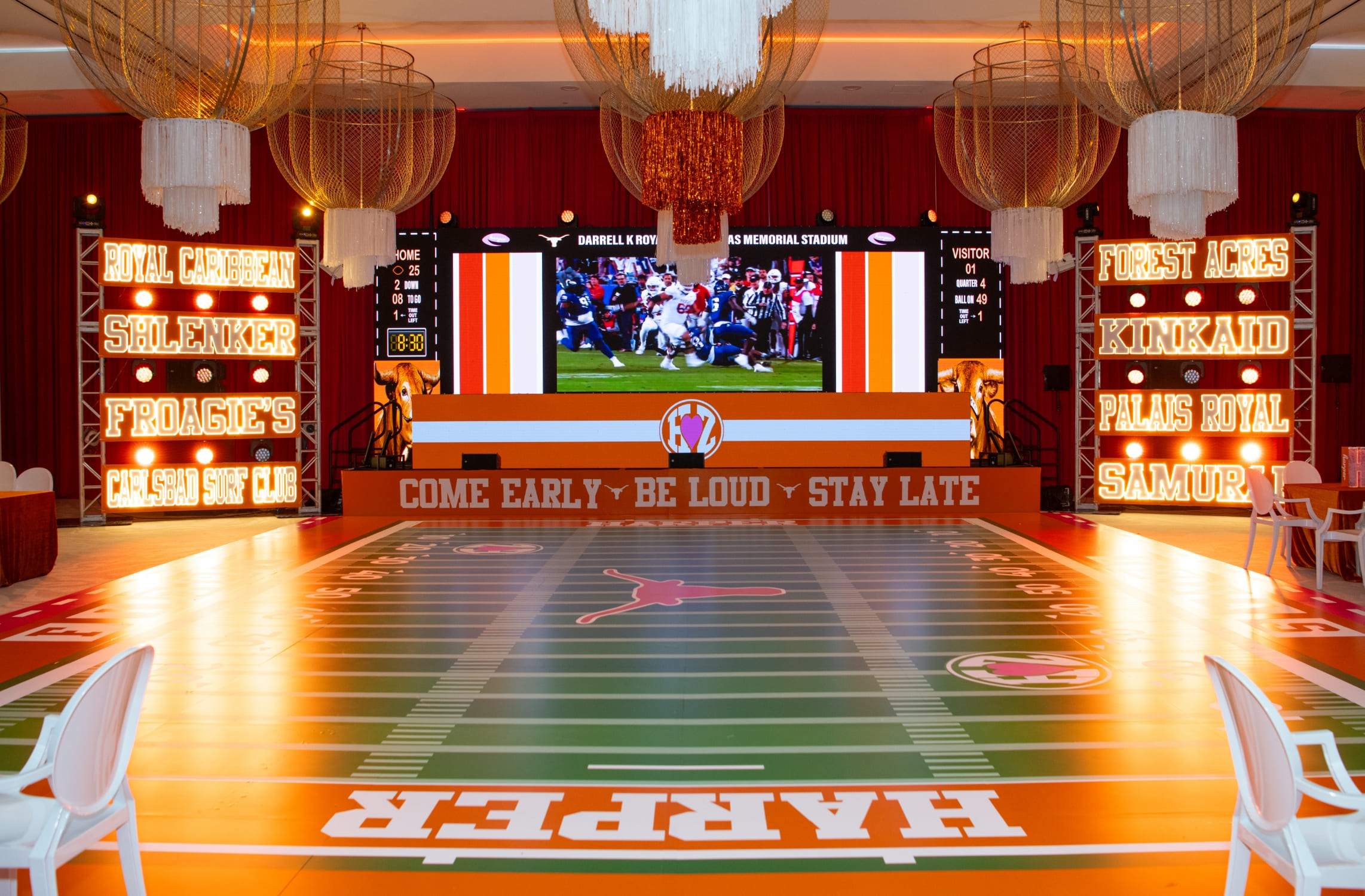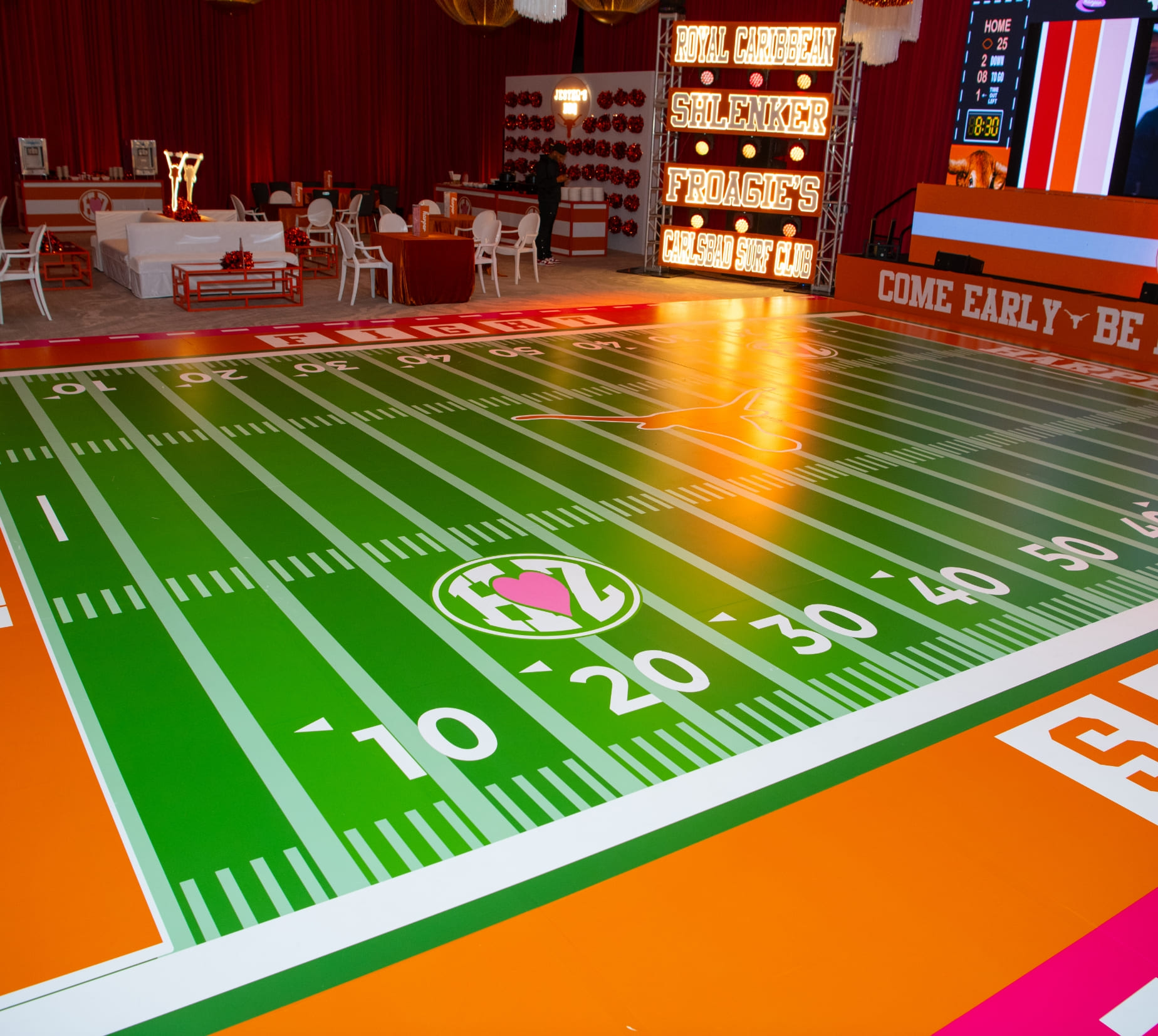 A massive screen streamed UT home game highlights, keeping the spirit of game day alive all night, while the dance floor designed to look like a football field kept guests dancing from kickoff to the final whistle.