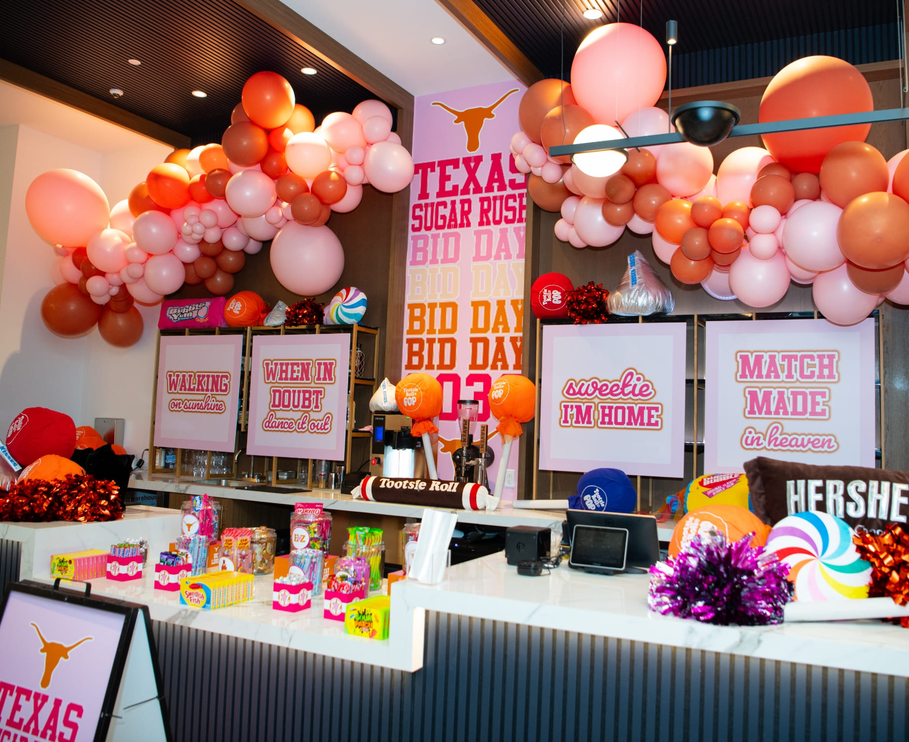 Each corner reflected the honoree’s favorite things and family traditions. A Longhorn inspired candy bar created a playful rush experience, inviting guests to “bid” on their favorite sweets in a nod to sorority rush traditions.